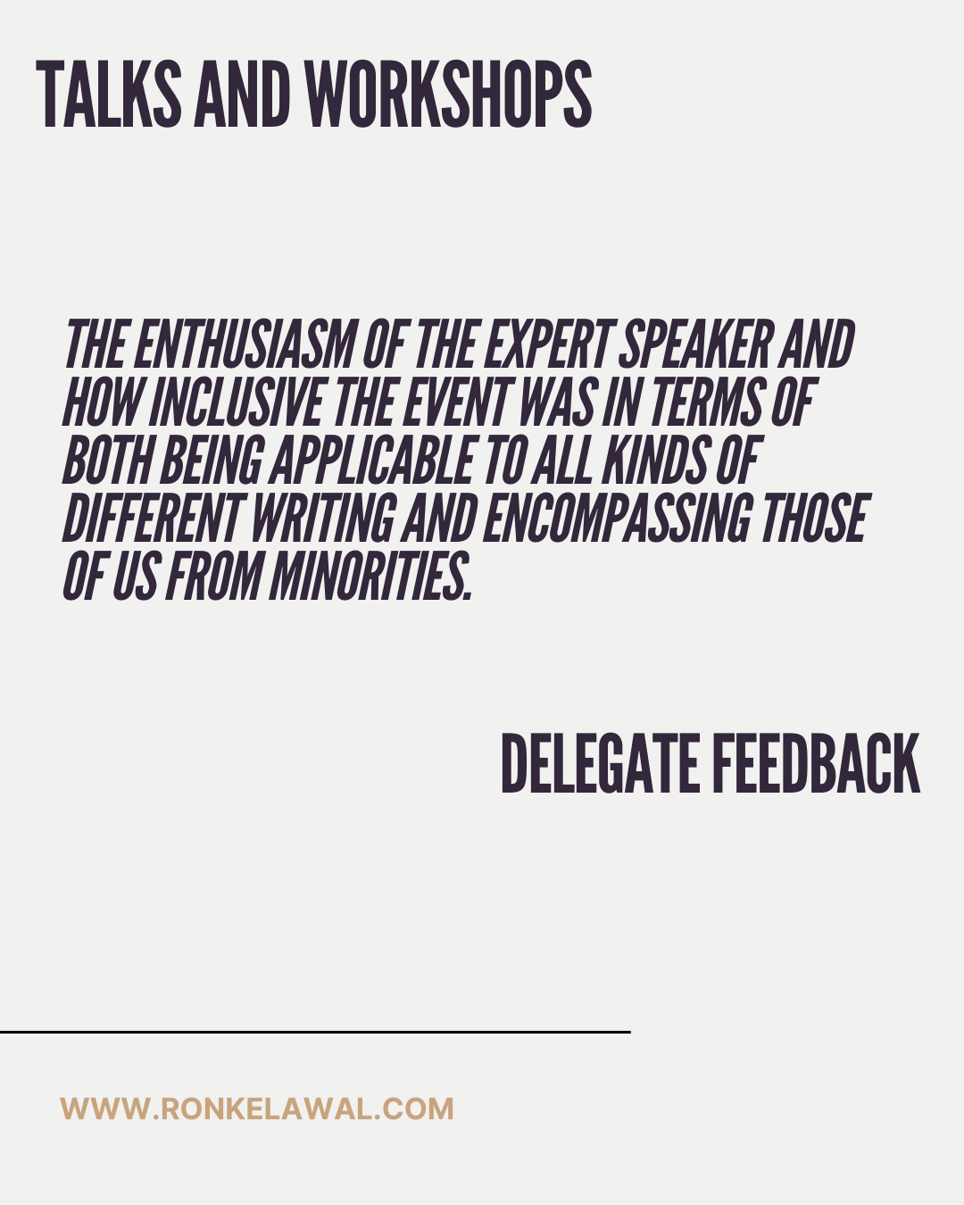 'Ronke took us all along together, proactively gaining our trust, and seeking questions and giving people the opportunity to speak and ask questions. The opportunity to do work in pairs and consider questions that I hadn't thought to ask myself as a first time author. She gave a lot of information and advice in a very short session which is impressive.'